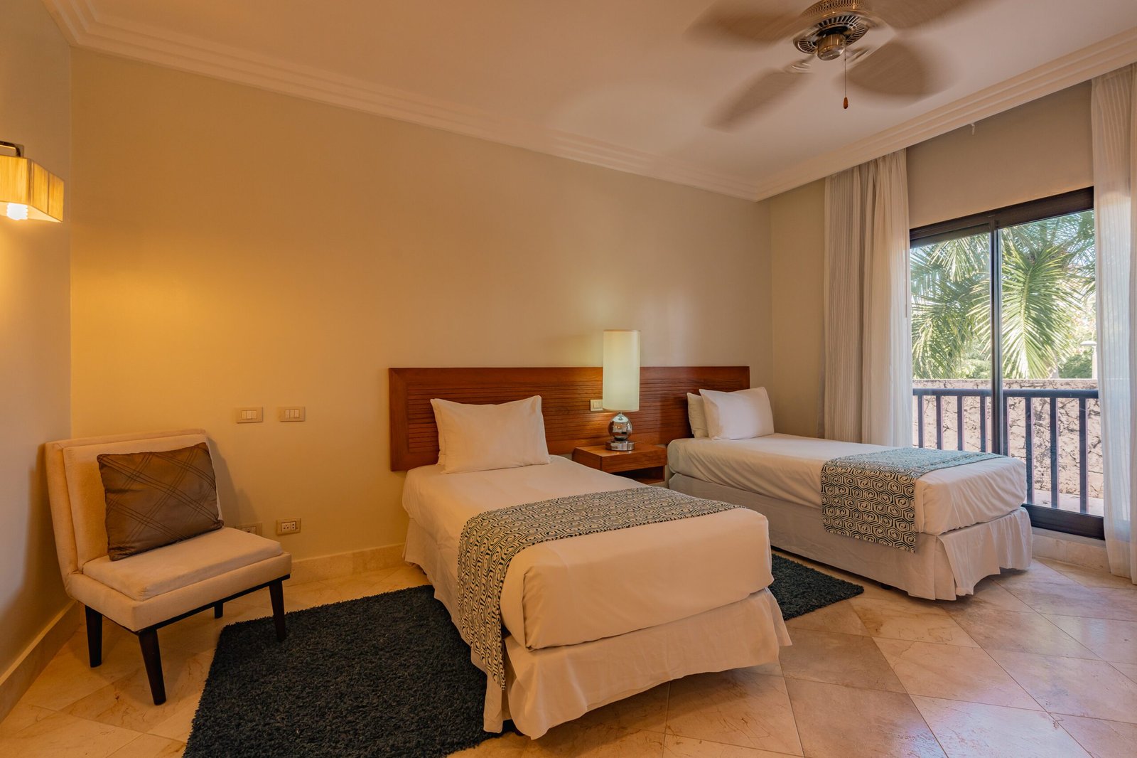 Three-bedroom unit (2,615.6 sq. ft.) featuring master bedroom with king-sized bed and walk-in closet, secondary bedroom with king-sized bed, third bedroom with 2 twin beds, furnished living/dining room area, 2.5 bathrooms, furnished terrace, and fully equipped kitchen; sleeps 8-10 comfortably.